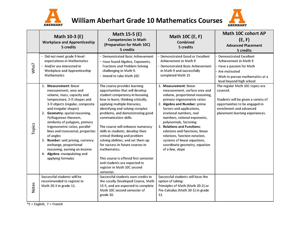 To register for Mathematics 10C, a student must have demonstrated Basic, Good or Excellent Achievement in Mathematics 9. For a student who did not meet grade 9 level expectations in Mathematics, the course options are Math 15, 10-3 or Math 10-4. Mathematics 10C is the starting point for the –1 and –2 course sequences (see diagram above).